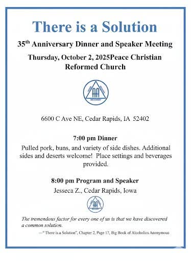 There is a Solution– 35th Anniversary Dinner and Speaker Meeting – Thursday, October 2, 2025. Dinner at 7pm, Program and Speaker 8pm. Peace Christian Reformed Church, 6600 C Ave NE, Cedar Rapids, Iowa 52402. Flyer here