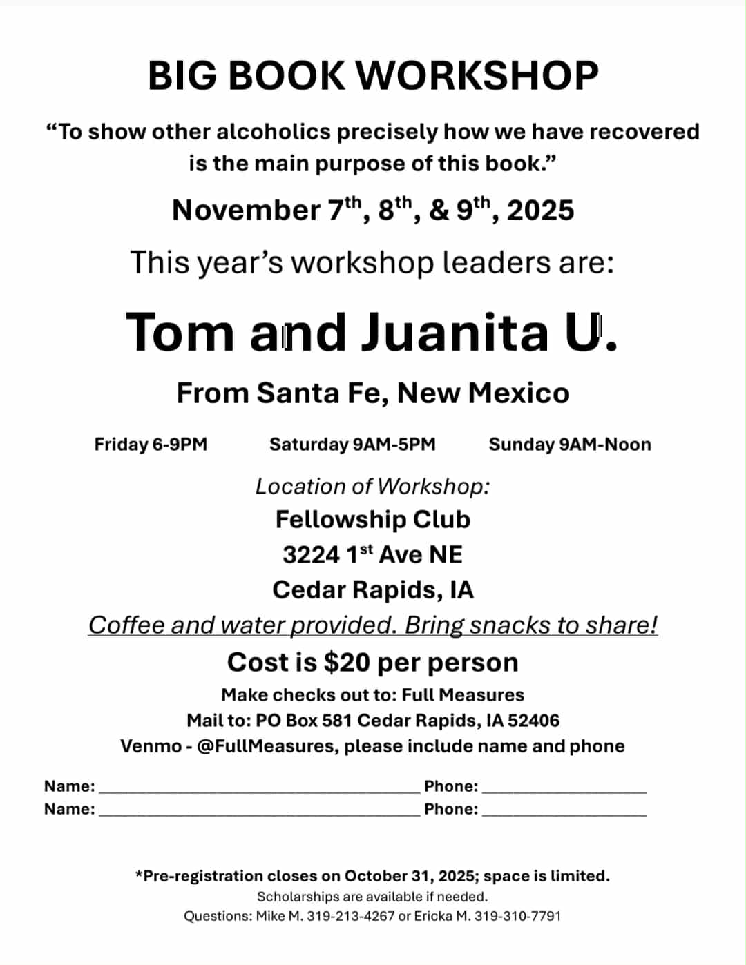Full Measure Big Book Workshop -November 7th-9th, 2025 – Friday 6pm-9pm, Saturday 9am-5pm, Sunday 9am -Noon – Presenters: Tom and Juanita U. from Santa Fe, NM – Cedar Rapids Fellowship Club 3224 1st Ave NE Cedar Rapids, IA 52402 – See Flyer Here