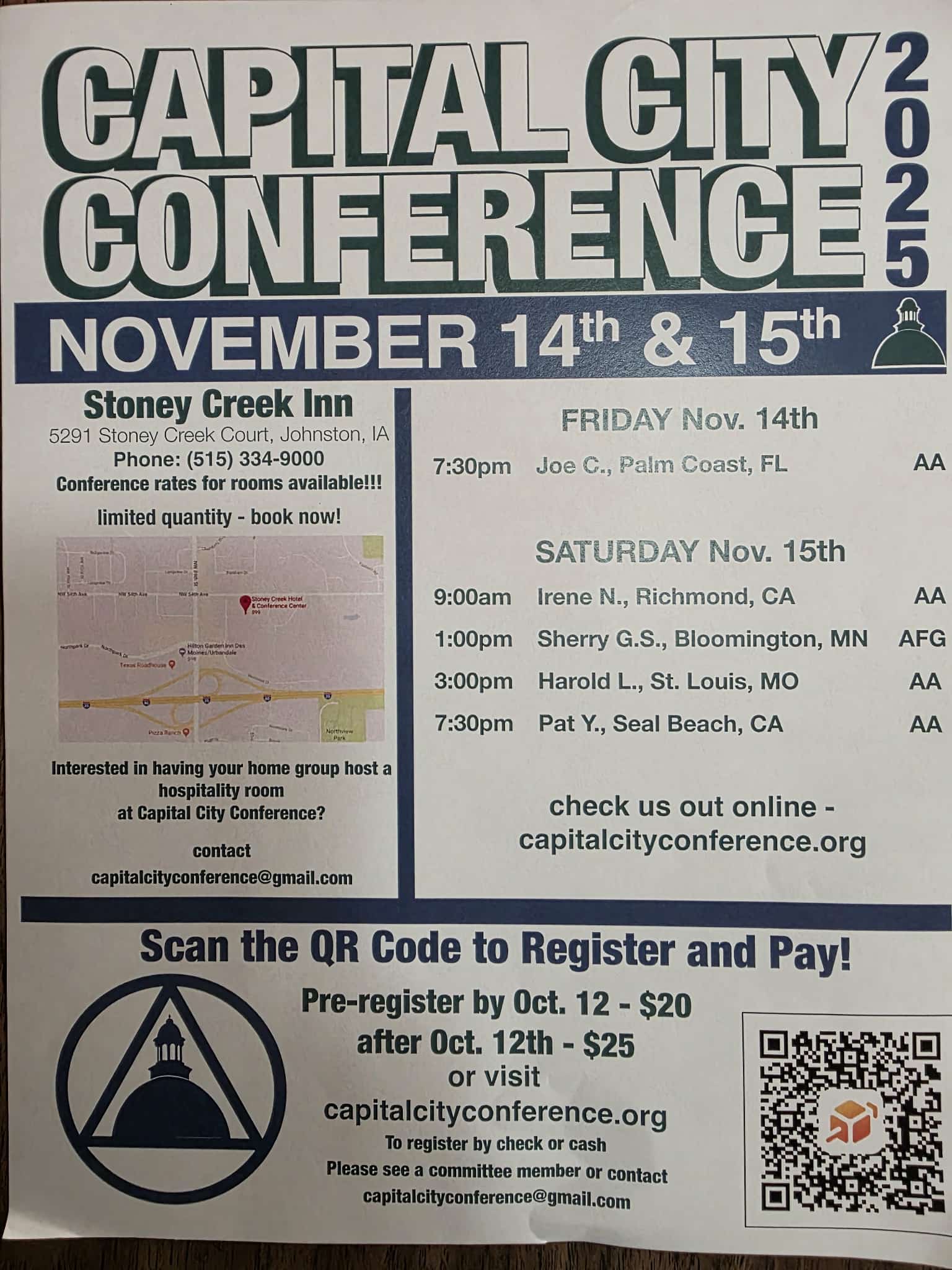 Capital City Conference 2025 – November 14th and 15th, 2025, Stoney Creek Inn, 5291 Stoney Creek Court, Johnston, IA – https://capitalcityconference.org/ see flyer here