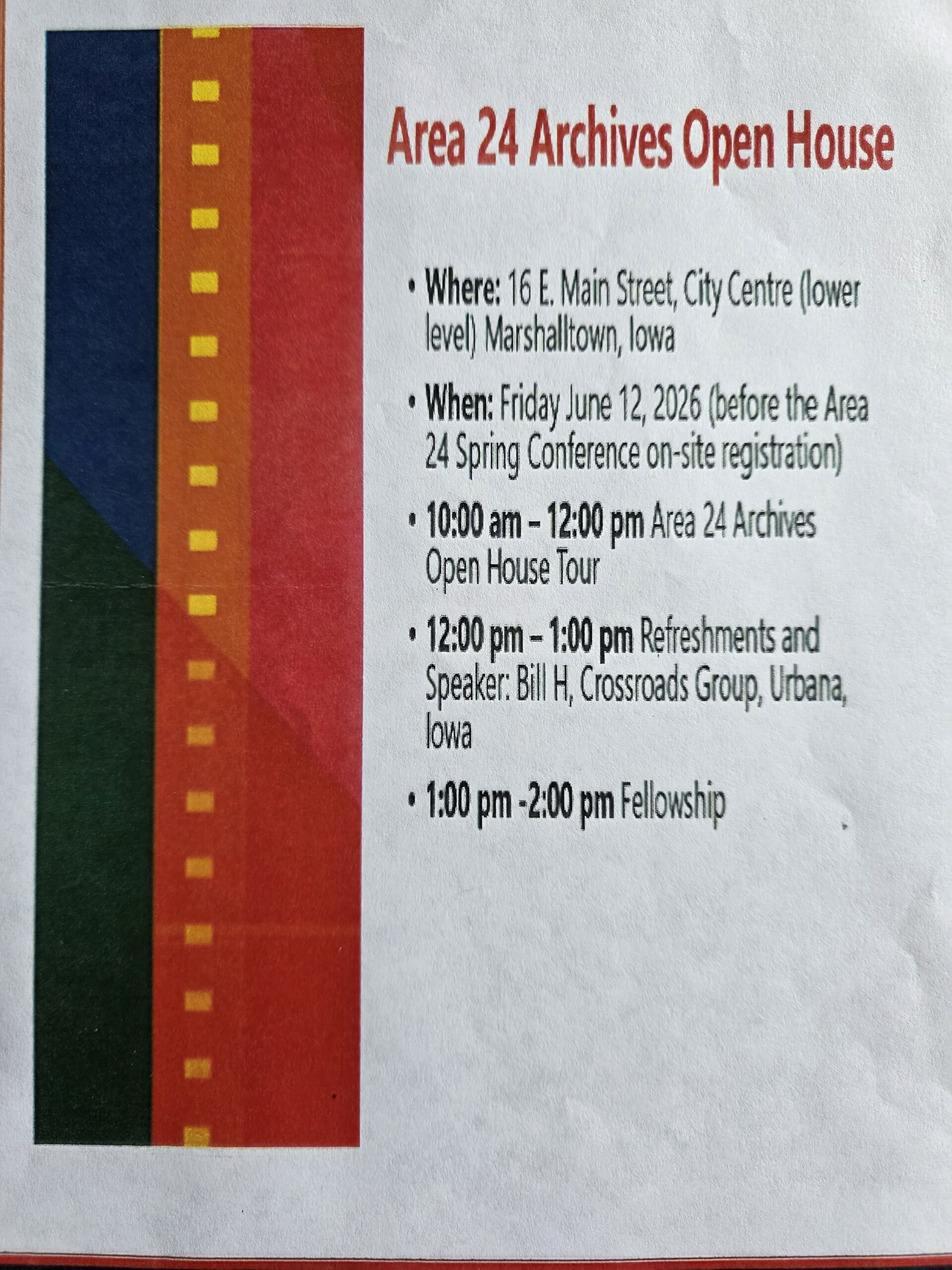 Area 24 Spring Conference – June 12-14, 2026 – IVBCS 3702 S. Center St, Marshalltown, IA see flyer  here