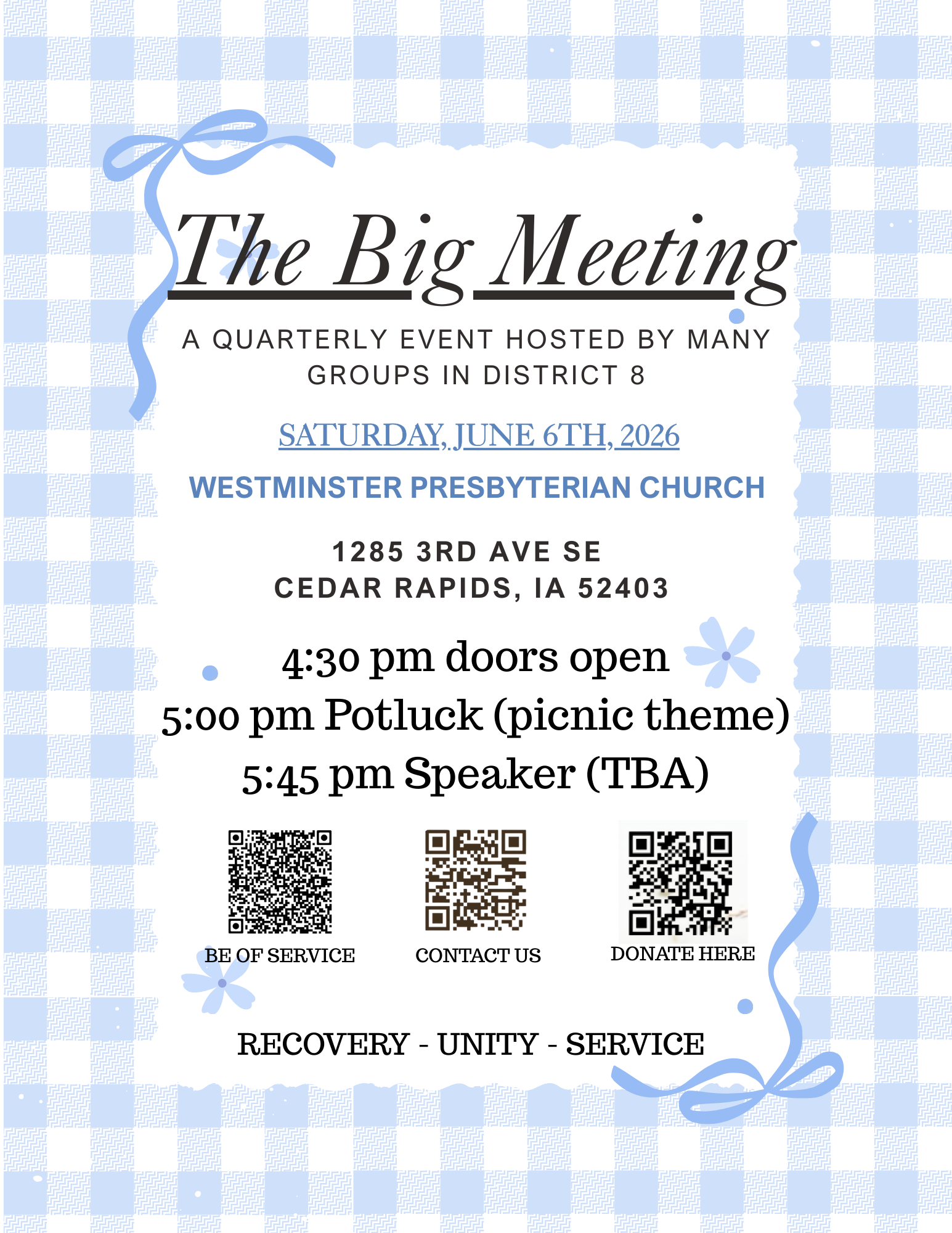 The Big Meeting – Saturday, June 6th, 2026 – Westminster Presbyterian Church 1285 3rd Ave SE Cedar Rapids, IA 52403 – See Flyer here for details