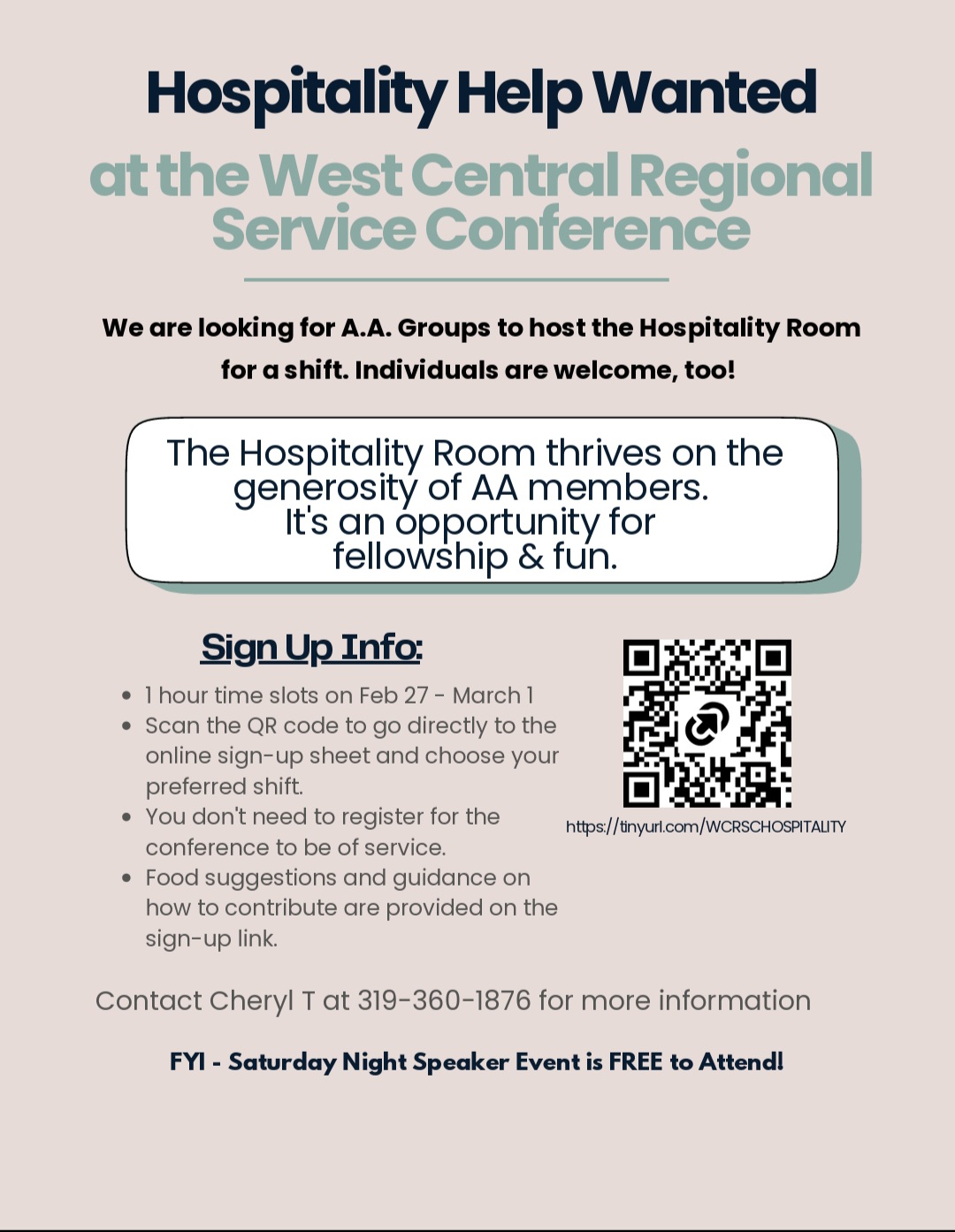 If you have a service opportunity to that you would like published, please contact the webmaster ( webmaster@aa-cedarrapids.org ) to have it posted!