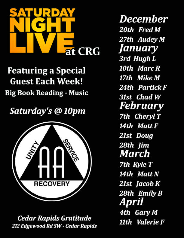 Cedar Rapids Gratitude Club 212 Edgewood Rd NW Cedar Rapids, IA 52405 (15 minute speaker followed by music and open discussion meeting format) Flyer here
